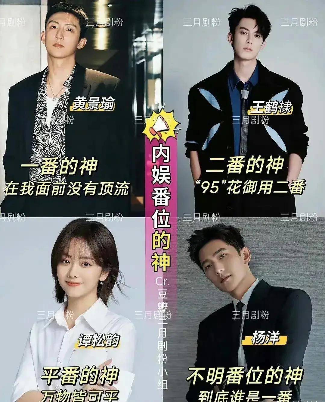 网友评选的四位“内娱番位的神”,黄景瑜、王鹤棣、谭松韵、杨洋纷纷上榜,一起来看看都是什么神?你怎么看待呢?