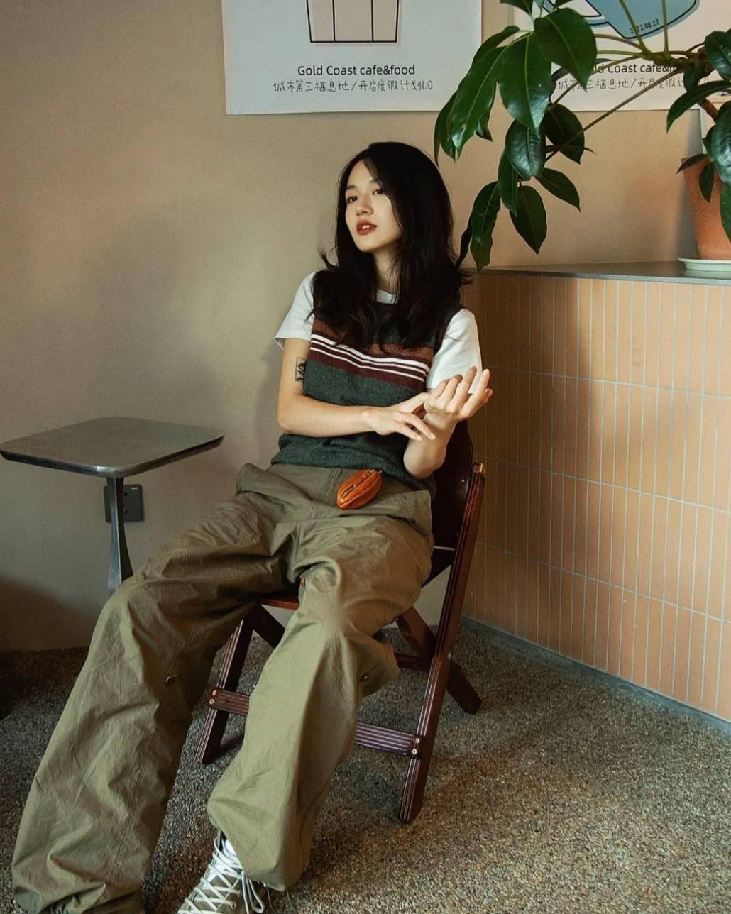 合身攻略:寬松工裝褲的簡約風格在選擇上衣時一定要遵循「彈力」效果。可搭配合身背心、T恤或針織短袖。