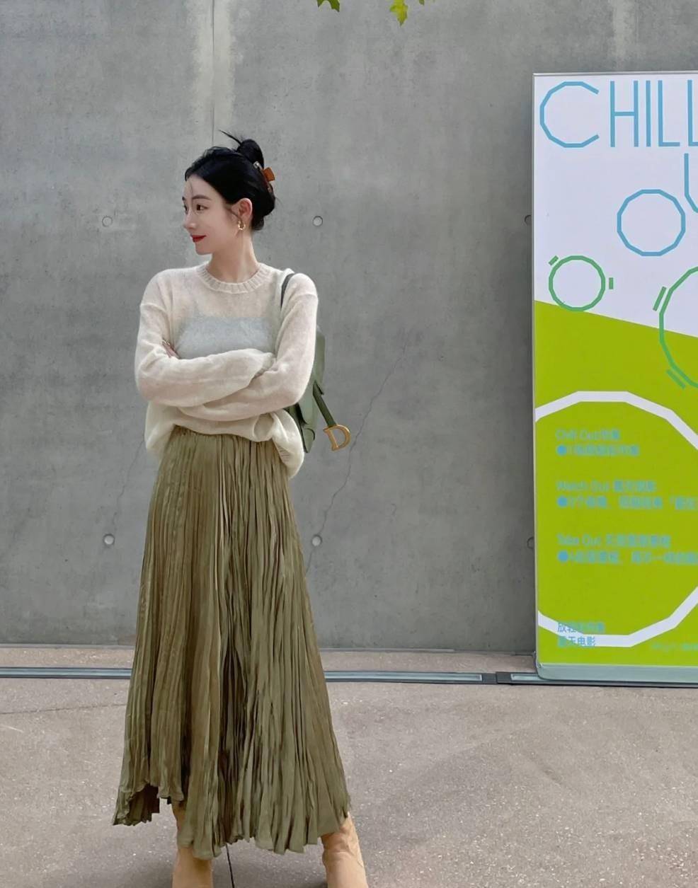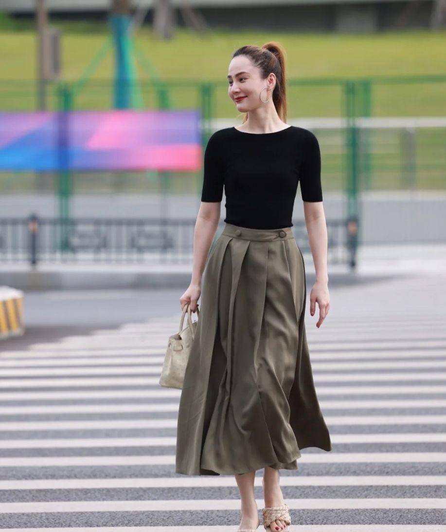 搭配策略:搭配韭菜綠裙子時,建議選擇淺色上衣的基礎款式,比如米色的時尚套頭衫,都值得嘗試;淡淡的皮膚紋路可以更好地增添女人味。