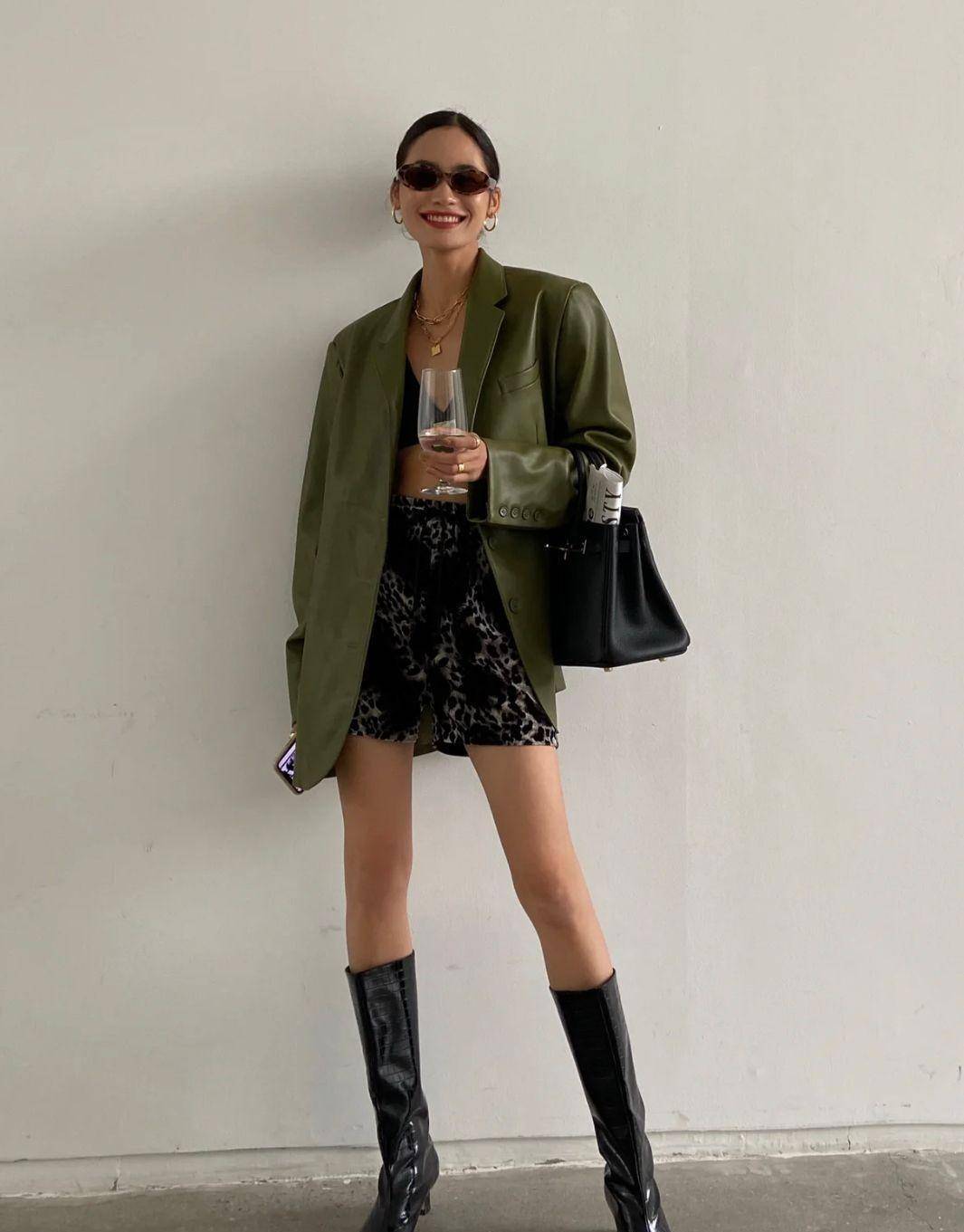 裸露下半身的穿搭方式一直深受女性歡迎,尤其是在炎熱的夏季,更不用說秀出大長腿是多麼的涼爽了。相比裹身褲和長裙,直接選一件。短裙,疊搭韭菜綠外套,能夠很好的體現出高級的造型感。