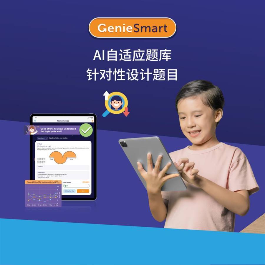 GenieSmart的AI自適應題庫,是一個海量的在線題庫,可以根據孩子的程度設計針對性練習。不斷推送掌握不到位的知識點相關習題給孩子,反復練習直至掌握,給孩子學習的自信心,引發自主學習的動力,讓孩子的學習進入一個良性循環。