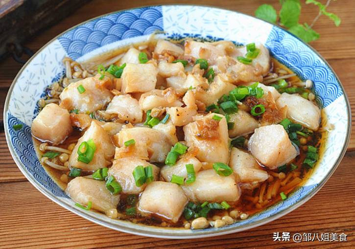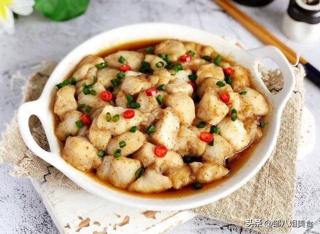 巴沙魚腌制后放在金針菇上擺好,再澆上蒜蓉汁,入鍋蒸十分鐘,撒些蔥花點綴,這道菜就做好了。愛吃雞肉的朋友,可以換成腌制后的雞丁,做法一致。