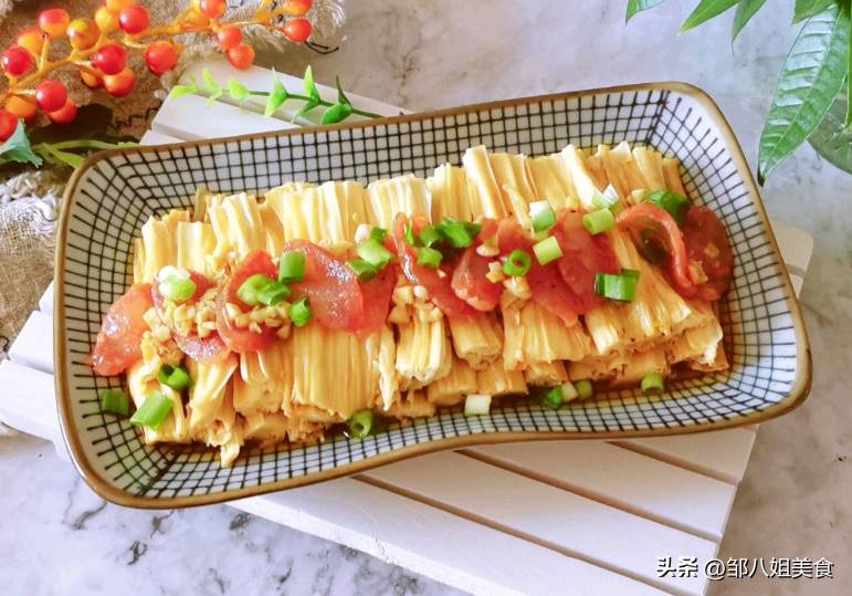 腐竹放進盤內擺好,再鋪上臘腸片,淋入料汁,入鍋蒸十分鐘。蒸好后,撒上蔥花,這道菜就做好了。不愛酸味的朋友,可以不放醋。