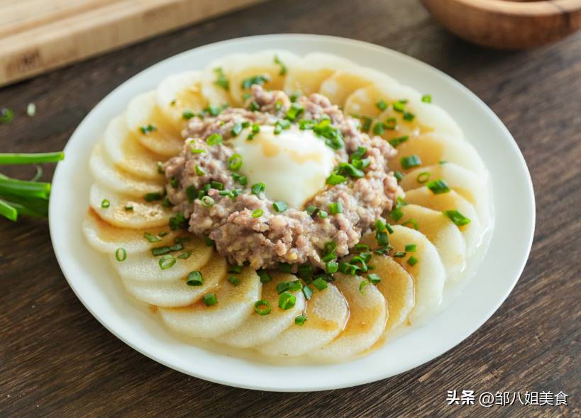 蒸好后,將料汁澆在山藥肉糜上,再撒些蔥花點綴,就可以食用了。