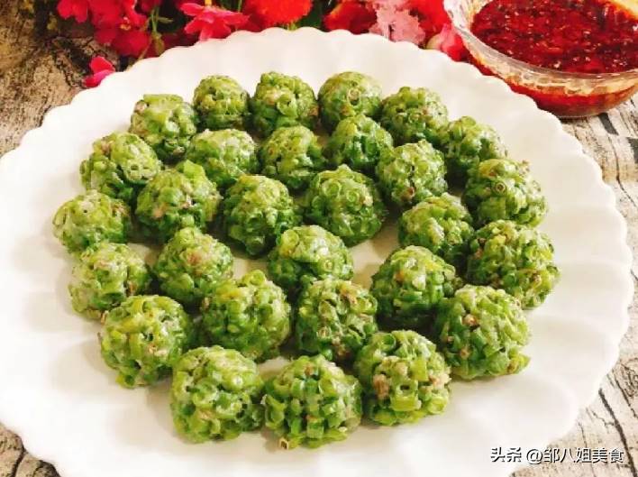 接著捏成若干個豆角丸子,放進蒸鍋內,大火蒸十分鐘,將丸子蒸熟透。