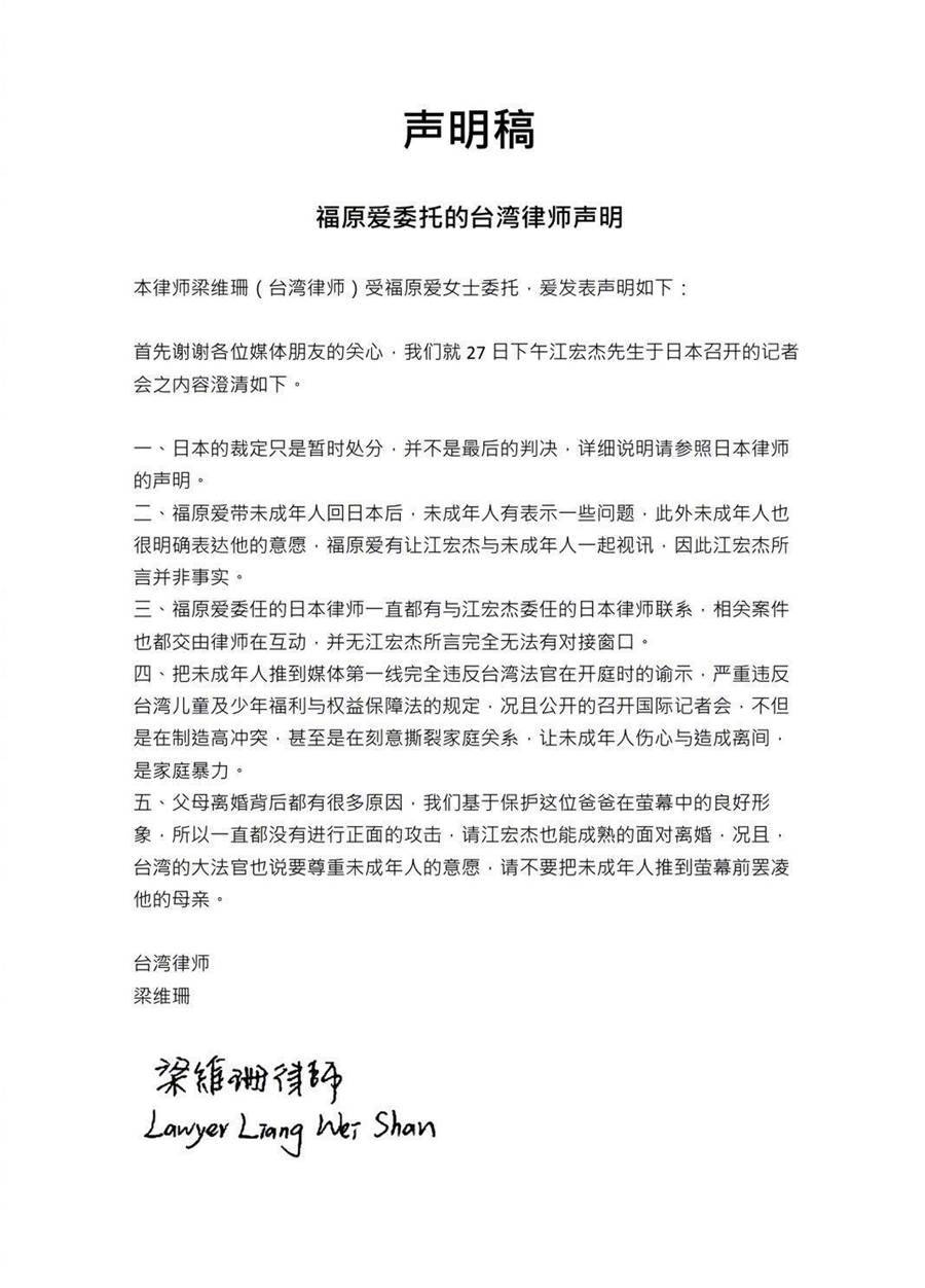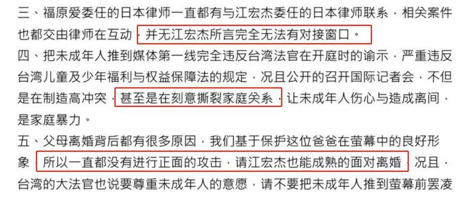 隨后,福原愛也火速針對記者會的內容進行了回應,福原愛通過律師回應了五點,通篇怒斥江宏杰將家事和孩子推到公眾面前,居心不良。福原愛稱自己身為一位母親,無論如何都會保護子女。直言大人之間的事情,不應該攤在公眾視線中。