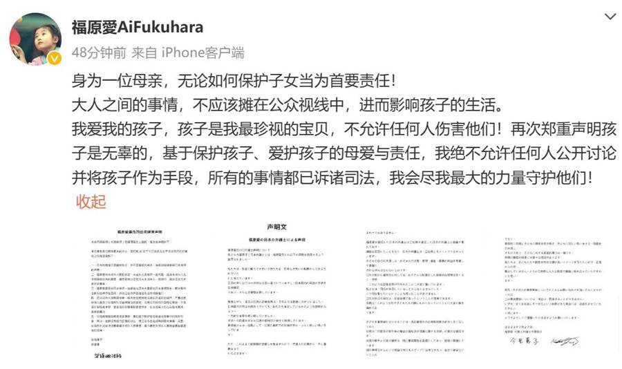 福原愛稱:「我愛我的孩子,孩子是我最珍視的寶貝,不允許任何人傷害他們!再次鄭重聲明孩子是無辜的,基于保護孩子、愛護孩子的母愛與責任,我絕不允許任何人公開討論并將孩子作為手段,所有的事情都已訴諸司法,我會盡我最大的力量守護他們!」