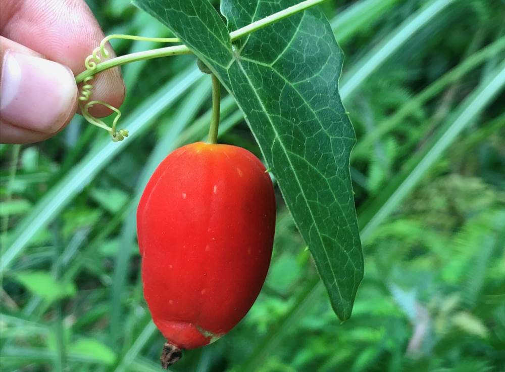 它的整個植株最高可以長到兩米,它是屬于雌雄同株的,每年大概4到8月開花,它的花非常的小,花冠是這種白色的,它的藤上經常是一邊開著花,一邊就已經結著果,而且它的產量非常高,這個植株上你看果實累累的,這種綠綠的,它不僅看起來有點像黃瓜,我們把它剝開,它里面的那個滋味也有點像黃瓜的味道,所以它還有個別名,也叫野黃瓜,也有人叫它土瓜,它成熟以后是這種紅色的,所以也有人叫它紅果果,鈕子果。