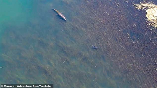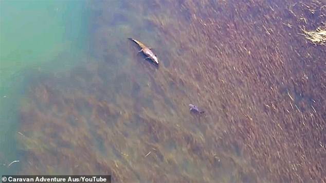 ▼Chelsea和男友Bryce在Ivanhoe Crossing度假,當時還有很多遊客,包括小朋友在淺水中垂釣、嬉戲。他們決定用無人機拍攝一些俯視鏡頭,沒想到竟拍到了鱷魚將公牛鯊嚇跑的畫面。