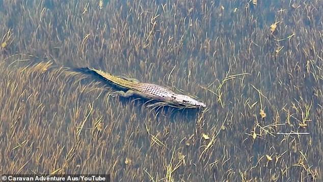▼那隻鱷魚大概有5公尺長,牠靜靜待在原地,似乎在等待公牛鯊自投羅網。公牛鯊直直向鱷魚的方向游過去,快到鱷魚面前時,牠好像感覺到了不妙,突然改變方向。Chelsea說:「牠們距我們玩水的地方只有幾公尺遠。