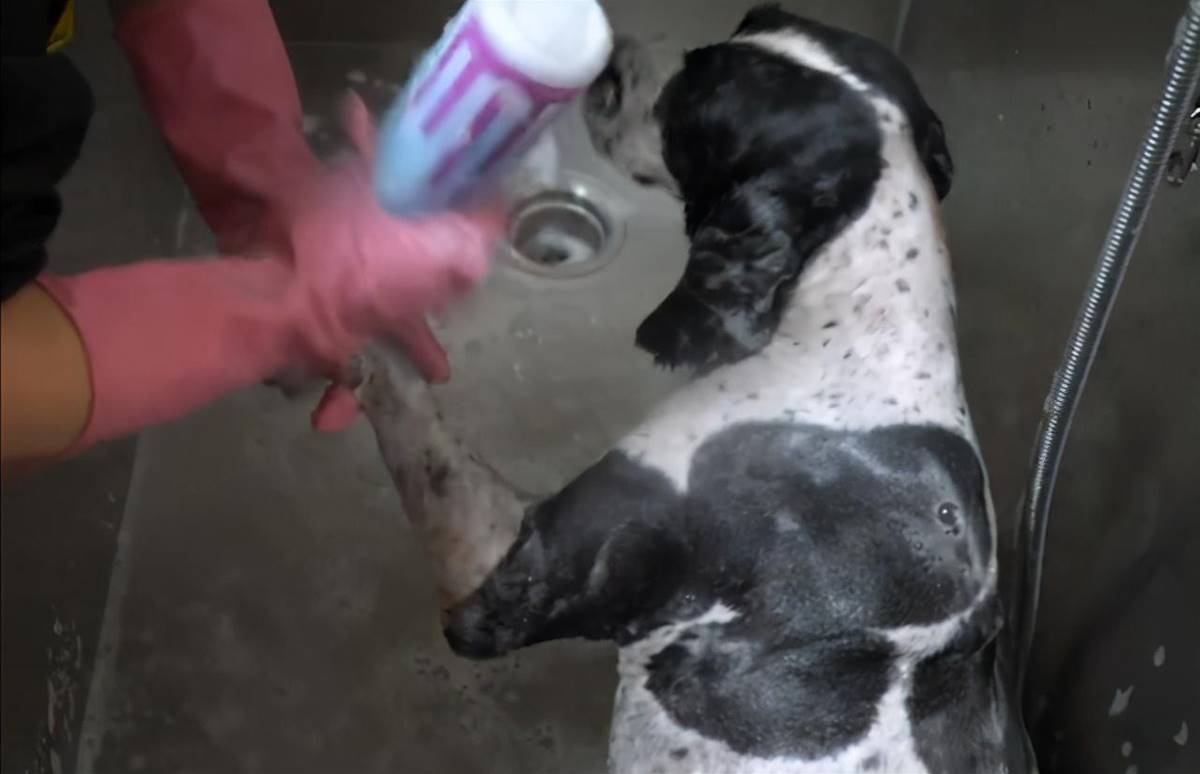 洗澡时冰洁很乖也很聪明,由于年龄太大不能长时间站立的它,找个了自己最舒服的姿势,任由美容师摆布。
