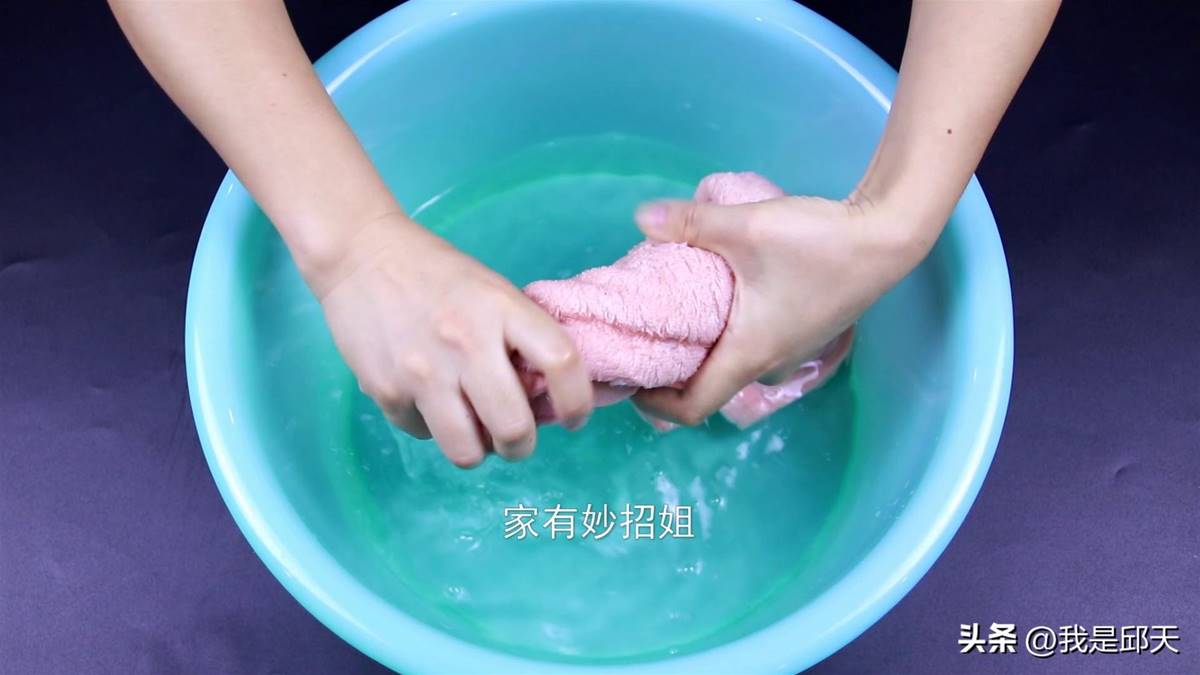 接着,我们只需将毛巾在水中简单的搓一搓,使毛巾上充分的吸收这个水分后,再拧成半干的状态就可以了。