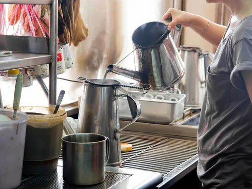 咖啡师傅会拿大汤勺咔咔盛好几大勺咖啡粉放进一个大壶里头,倒半壶开水,用巨型搅拌棒搅拌均匀,然后倒进另一个架好滤布的壶里进行过滤。一些咖啡店会来来回回多倒几次,追求过滤得更彻底,口感更“滑”。