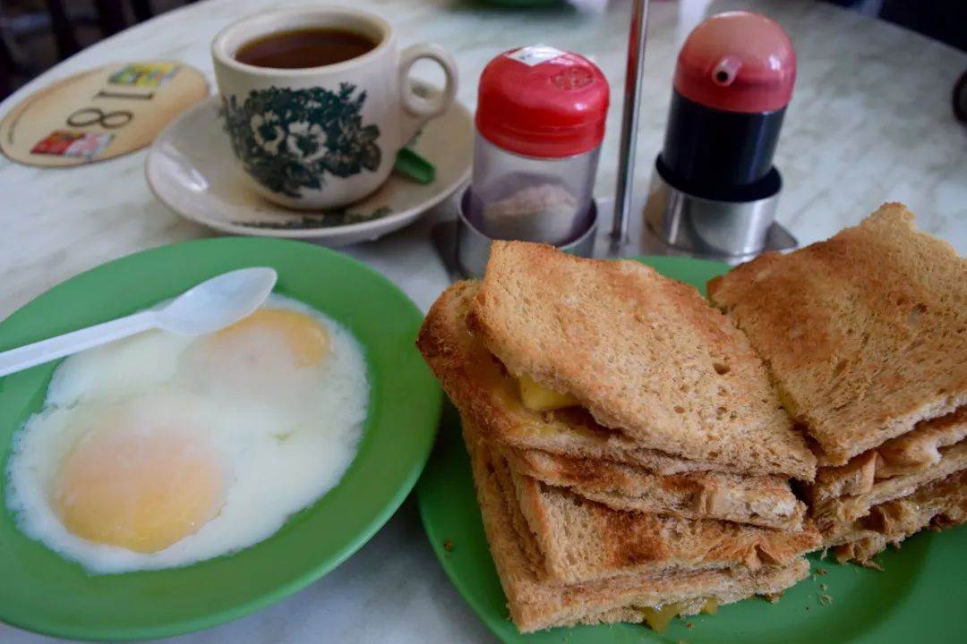 南洋咖啡店长得比较像路边大排档,就是大爷们穿着人字拖、看报聊天的地方。一些新马本地人会在此基础上选择用咖啡蘸油条,或者蘸本地特色早点——烤面包涂椰子黄油,或者直接在咖啡里加一片咸黄油。