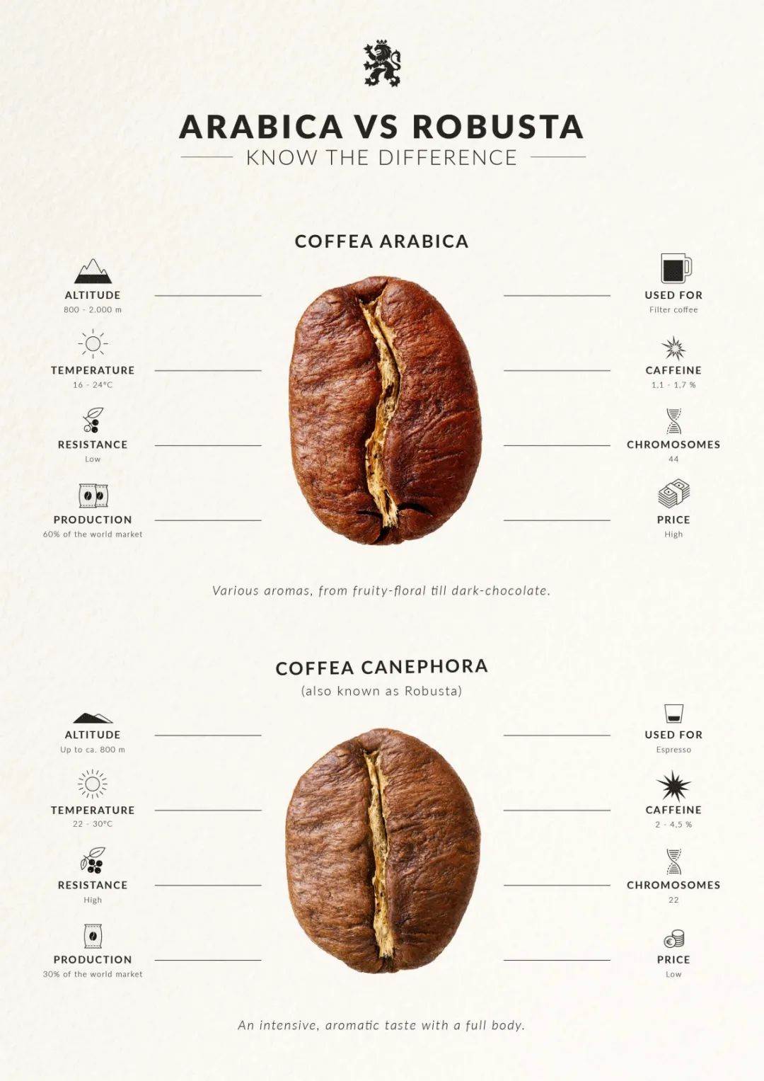 上为阿拉比卡,咖啡因含量约1.1-1.7%;下为罗布斯塔,咖啡因含量约2-4.5% | piogastrobistro.com