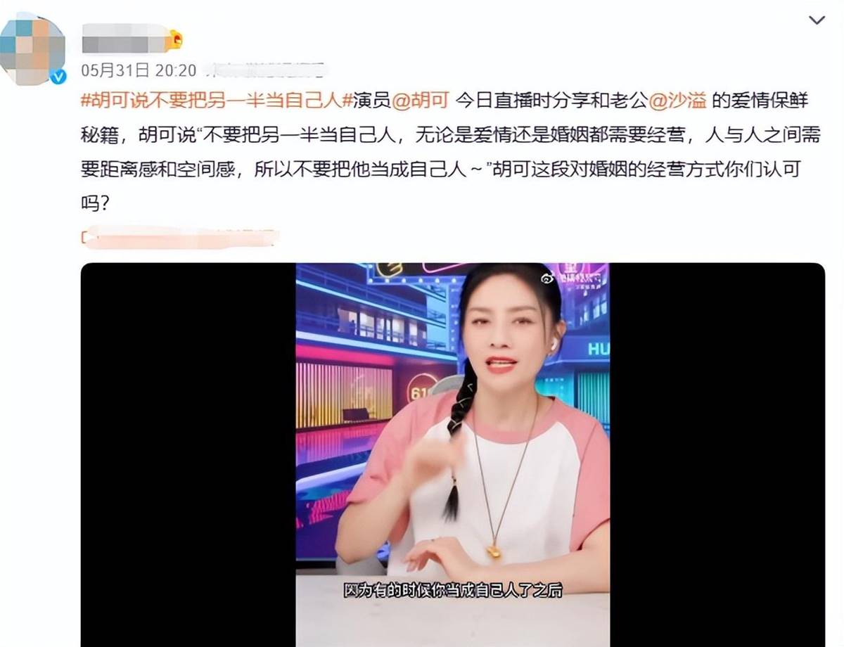 或许也是因为没能平衡婚姻与事业等种种方面,让胡可在采访中说出“不要把另一半当自己人,无论是爱情还是婚姻都需要经营,人与人之间需要距离感和空间感,所以不要把他当成自己人”这样的话吧。