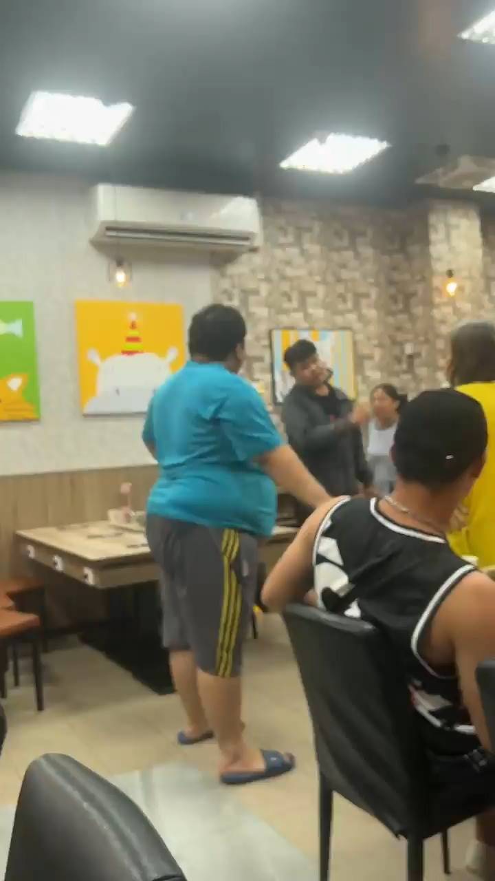 蓝色上衣男和同桌不认识的男子不知何因发生口角,先是拿饮料往对方的小朋友泼,随後抓了火锅就要往对方泼,还衝上去打人,影片是已经泼完饮料和汤了,听到对方要报警,甚至连无辜的店员都攻击,之後在等警察来还直接抽起菸!虽然不知道详细原因如何,但是现场还有很多小朋友,真的很危险!