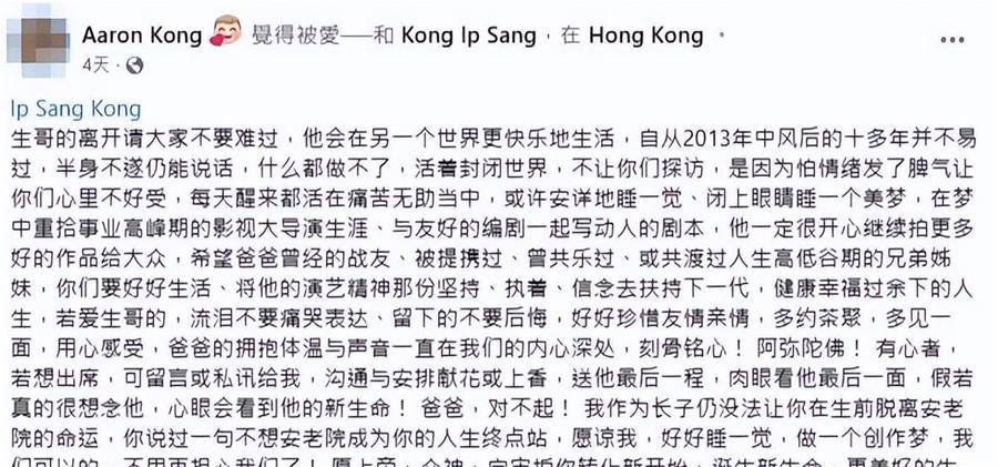 鄺澄峰稱鄺業生離開前很平靜,屬自然去世,對爸爸而言是一種解脫,可以在睡夢里繼續暢想與友人們一起寫劇本,請大家不用難過。