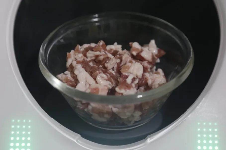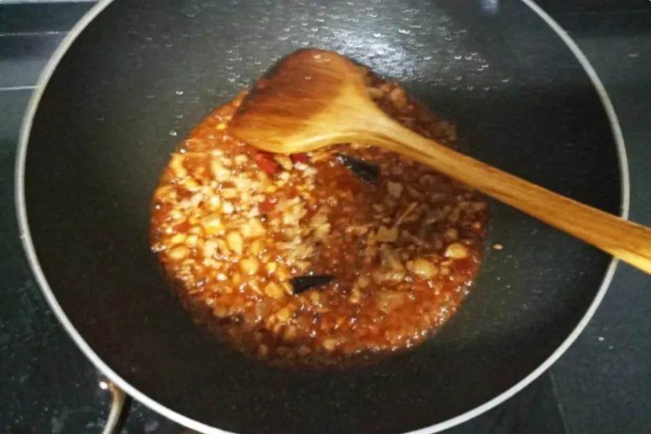 4、往炒鍋內加入半勺底油,把油燒熱后下入肉末用小火炒香,沿鍋邊烹入少許白酒去腥增香,再淋入少許老抽調顏色,然后加入2勺清水,加入半勺鹽、半勺白糖、一勺雞精、一勺生抽調味。
