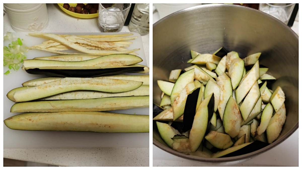 1、把茄子去蒂洗凈后豎著從中間劈開,接著再劈開,一根茄子總共切成4瓣,平著把茄子芯 切掉不要,然后斜刀切成菱形塊備用。