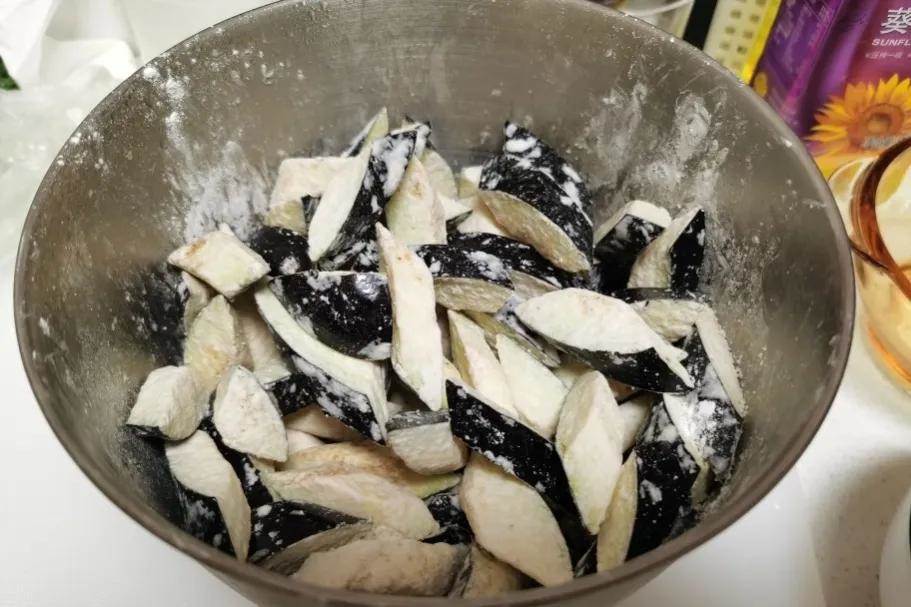 先撒上清水拌勻能增加茄子的粘性,淀粉不容易脫落,拍兩遍淀粉炸好的茄子會更加酥脆。淀粉還能堵住茄子果肉上的小孔,下鍋炸的時候不會吸油。