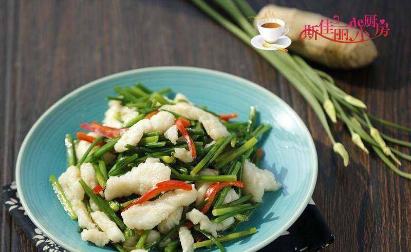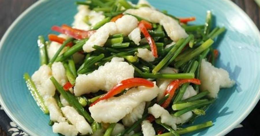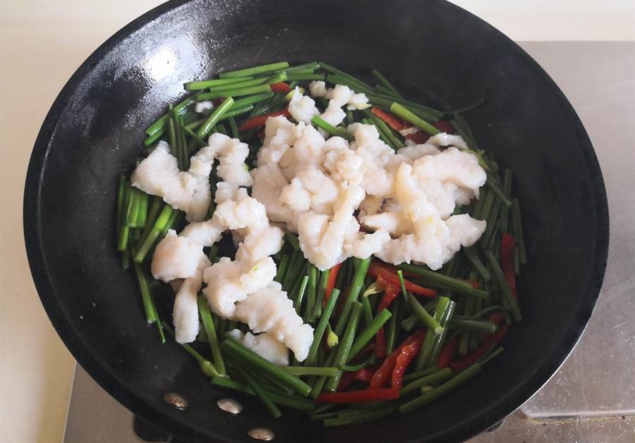 原料: 韭菜苔 龍利魚 紅椒 姜絲 料酒 淀粉 油鹽