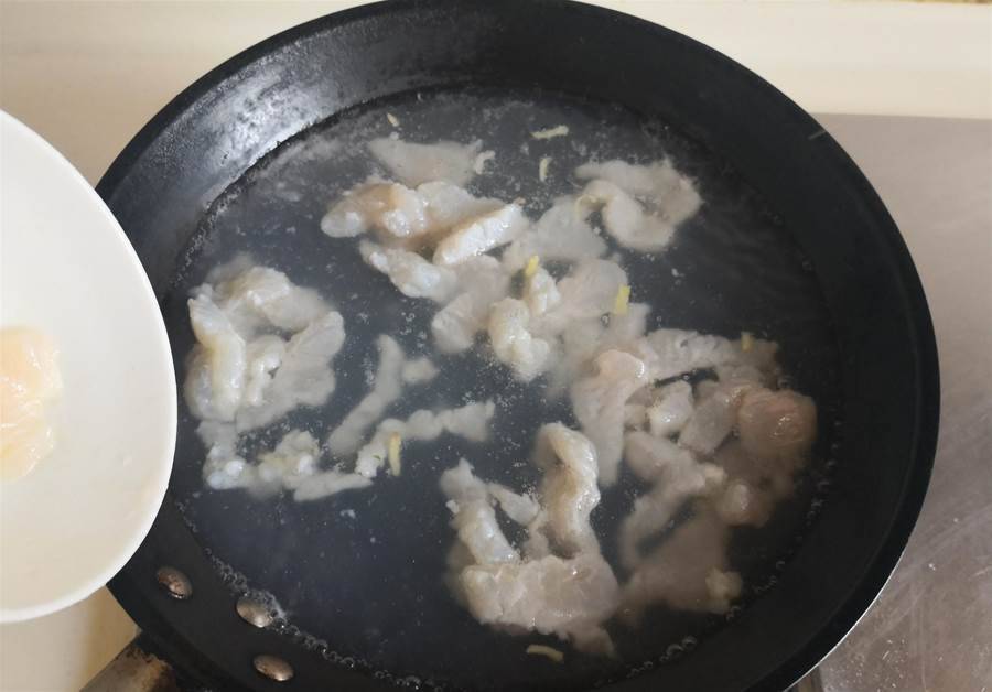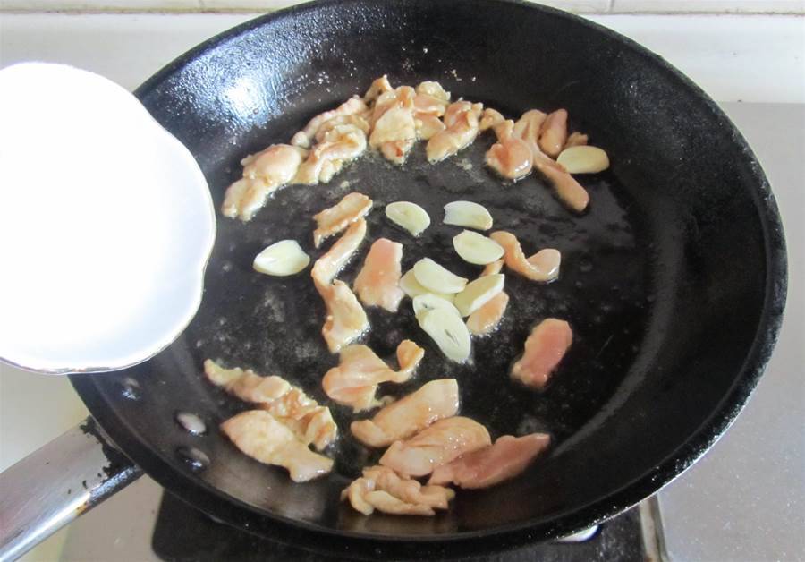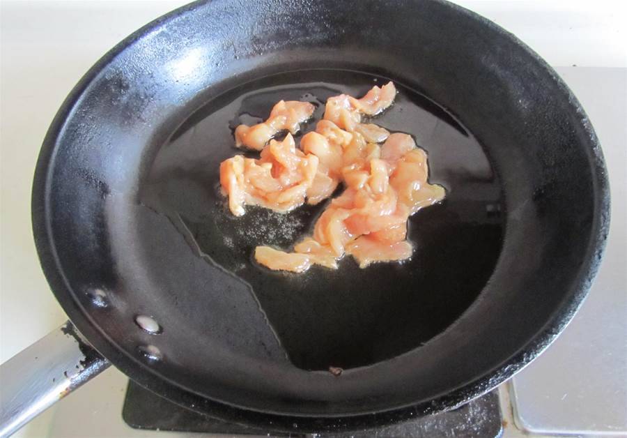 3. 熱鍋涼油,將腌制好的雞脯肉片放進鍋中翻炒至變色;