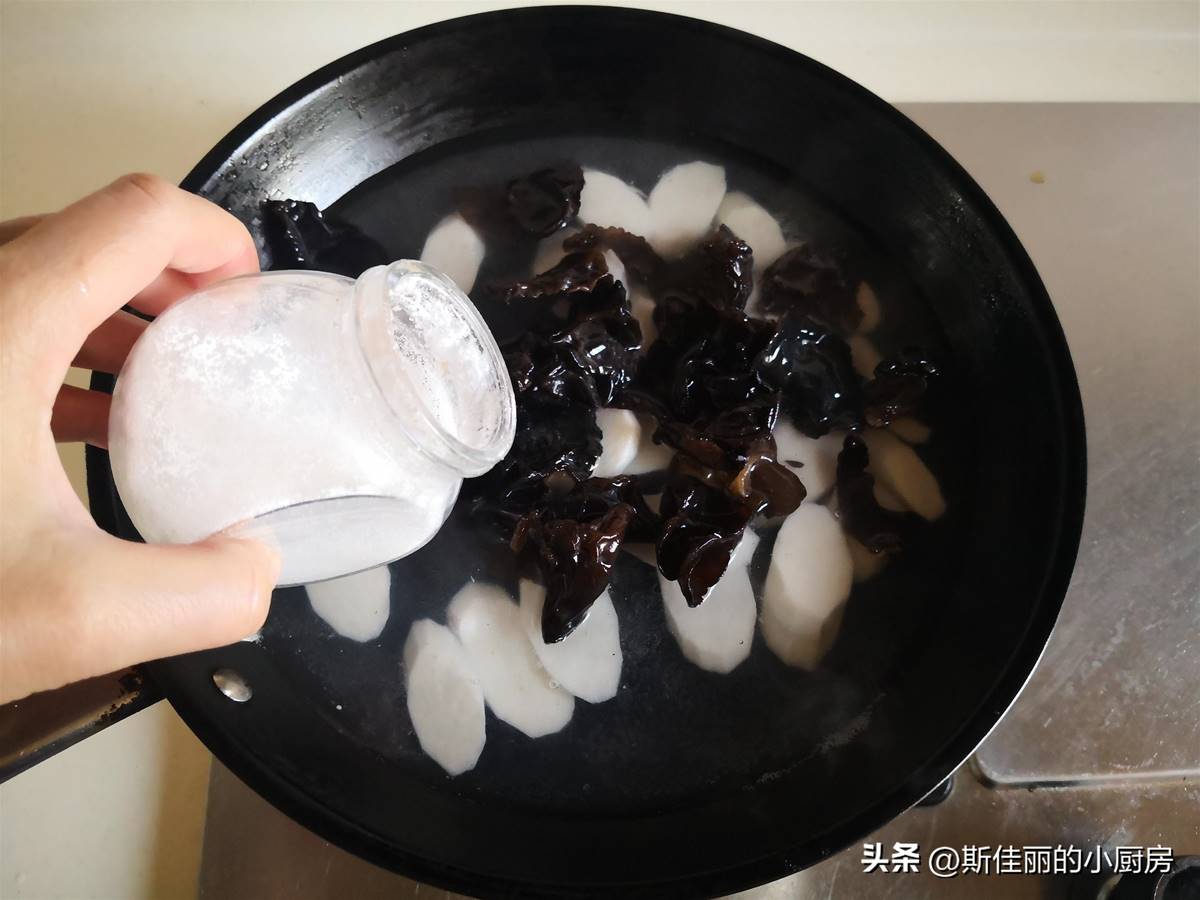 制作:1. 先將黑木耳提前用冷水泡軟; 燒鍋水加入1小勺鹽, 將準備好的鐵棍山藥和泡軟的黑木耳放進鍋中焯煮兩分鐘撈出備用;