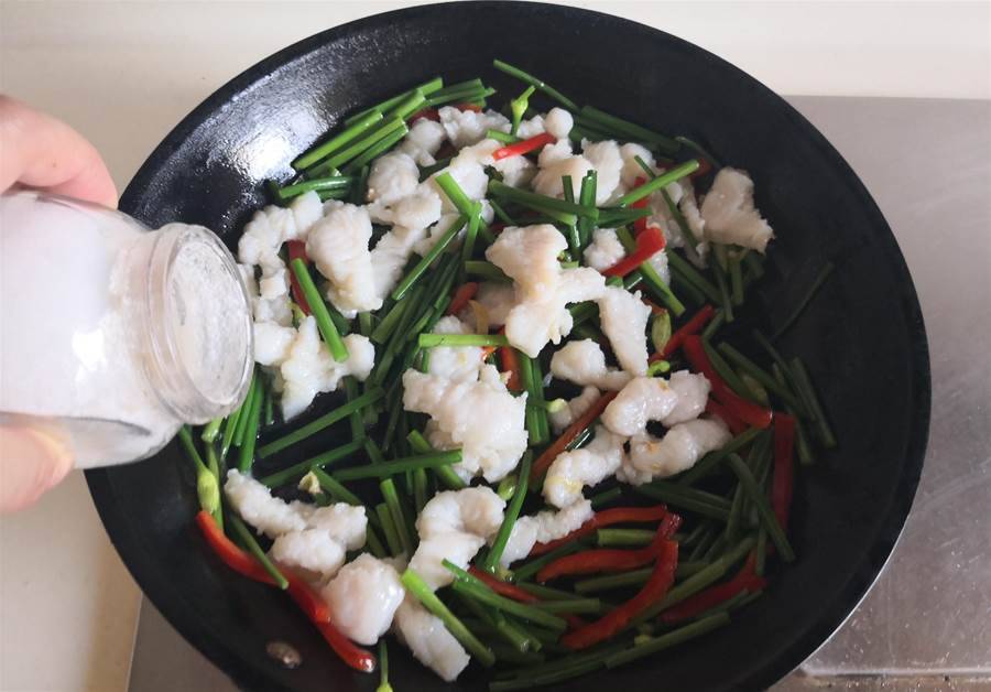 6. 食材炒至九成熟時加入適量的鹽調味,翻炒均勻即可。