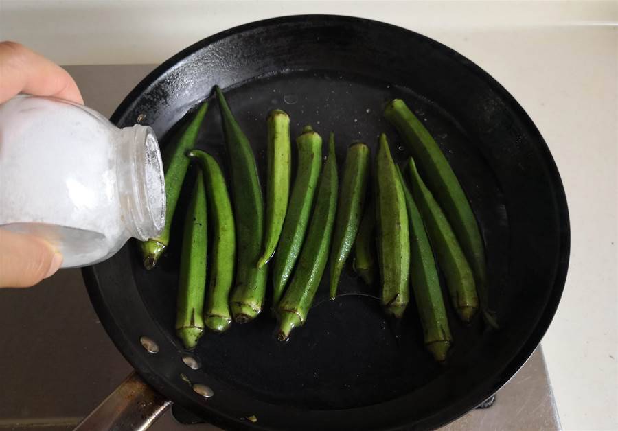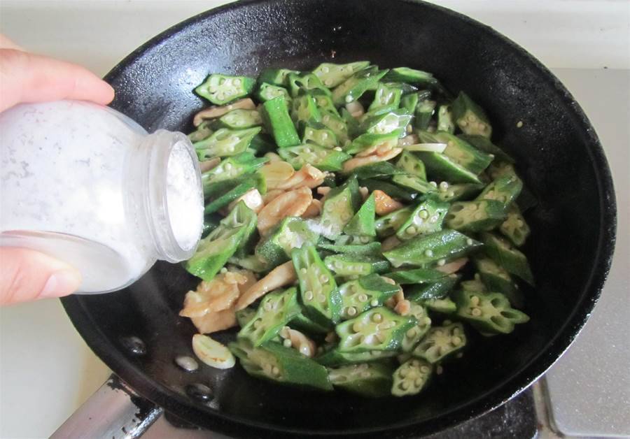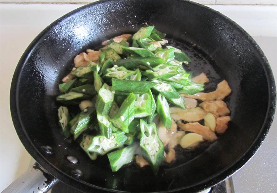 5. 加入準備好的秋葵進鍋翻炒幾下;