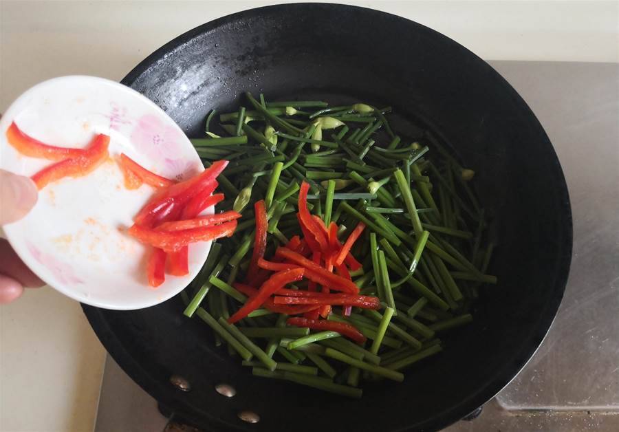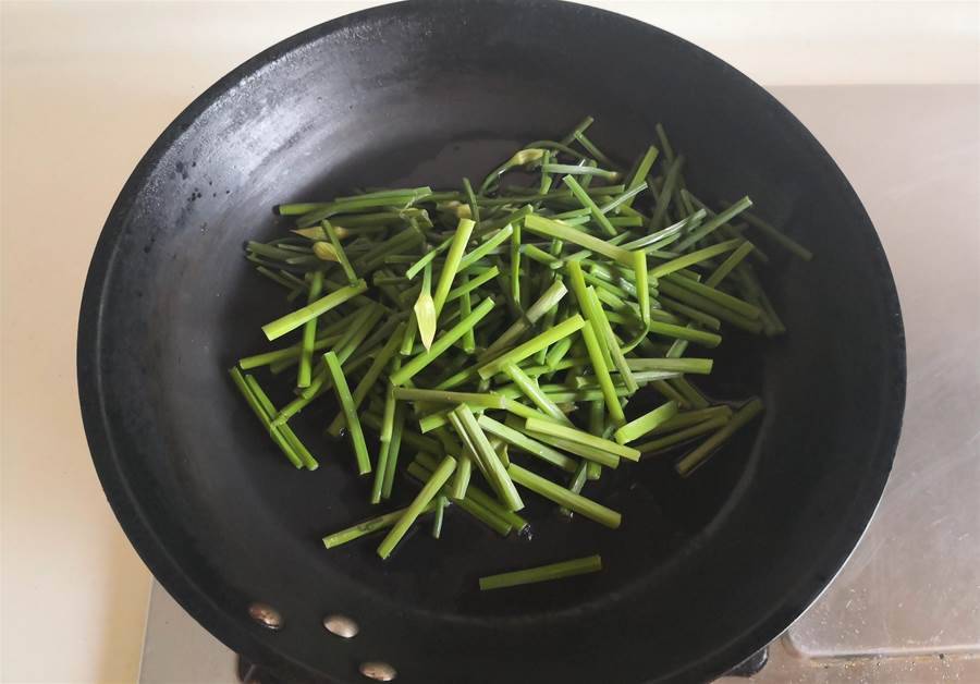 3. 熱鍋涼油,將準備好的韭菜苔放進鍋中翻炒兩下;