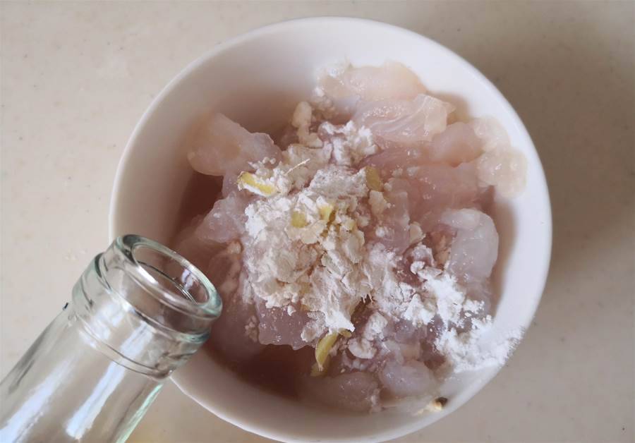 制作:1. 龍利魚條后加入少許鹽、淀粉、料酒和姜絲等調味料拌均勻腌制一下;