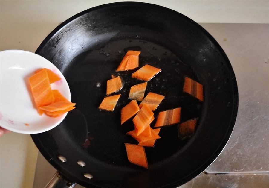2. 熱鍋涼油, 將胡蘿卜片放進鍋中翻炒幾下,這樣更利于胡蘿卜素的吸收;