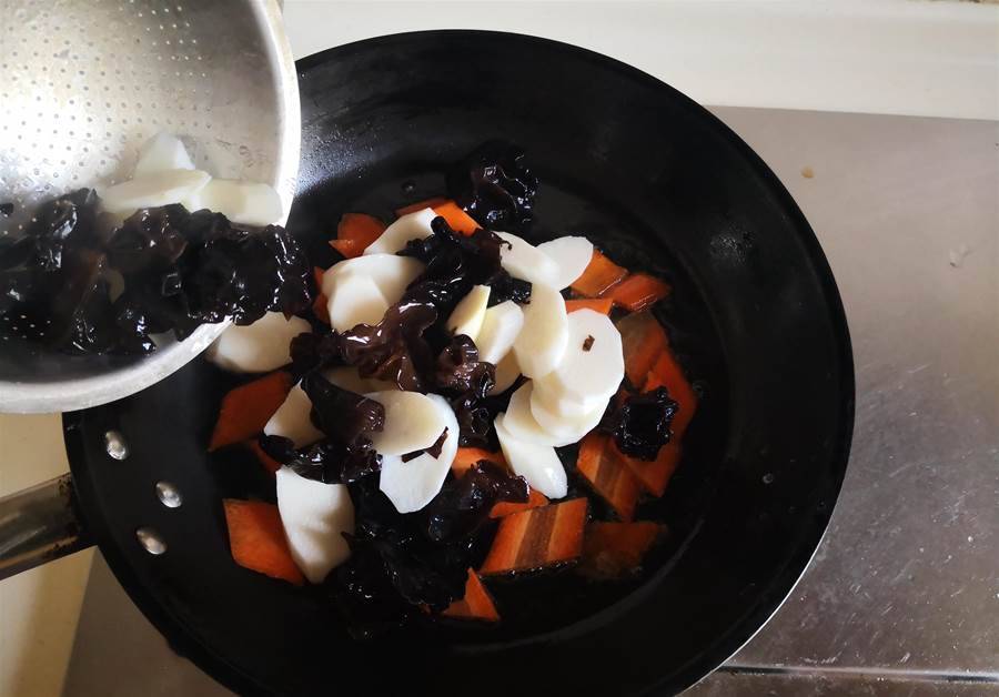 3 .加入焯好的鐵棍山藥和黑木耳進鍋繼續翻炒幾下;