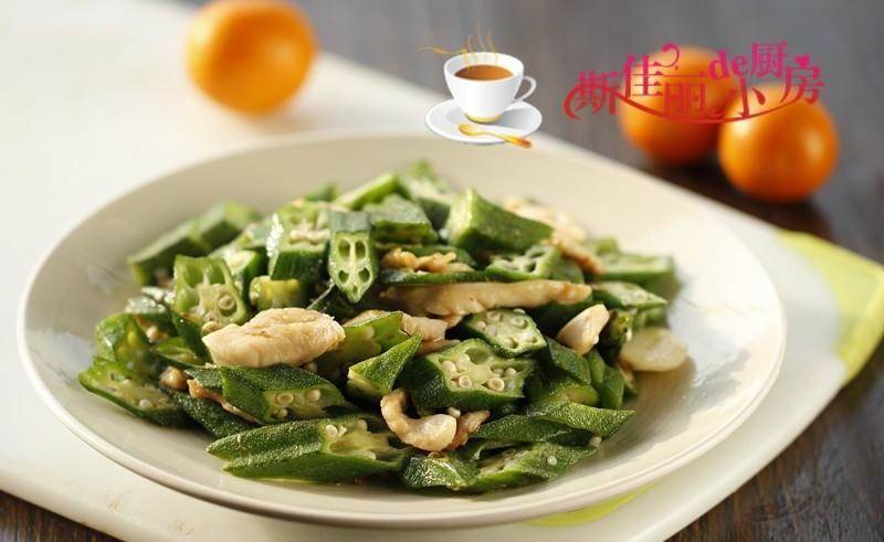 原料: 秋葵 雞脯肉 蒜 生抽 料酒 淀粉 油鹽