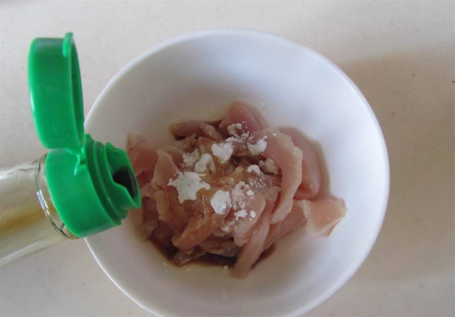 制作:1. 雞脯肉切成加入少許鹽、生抽、料酒和淀粉等調味料拌均勻腌制一會兒;
