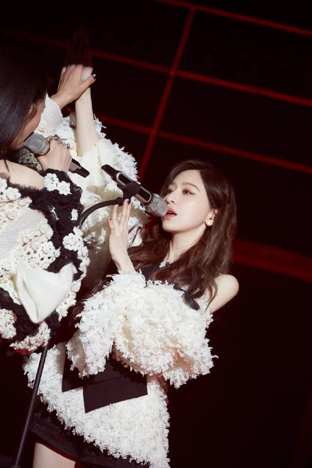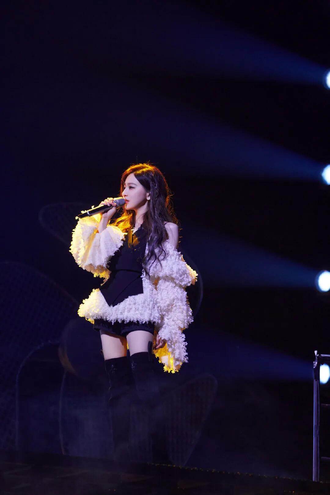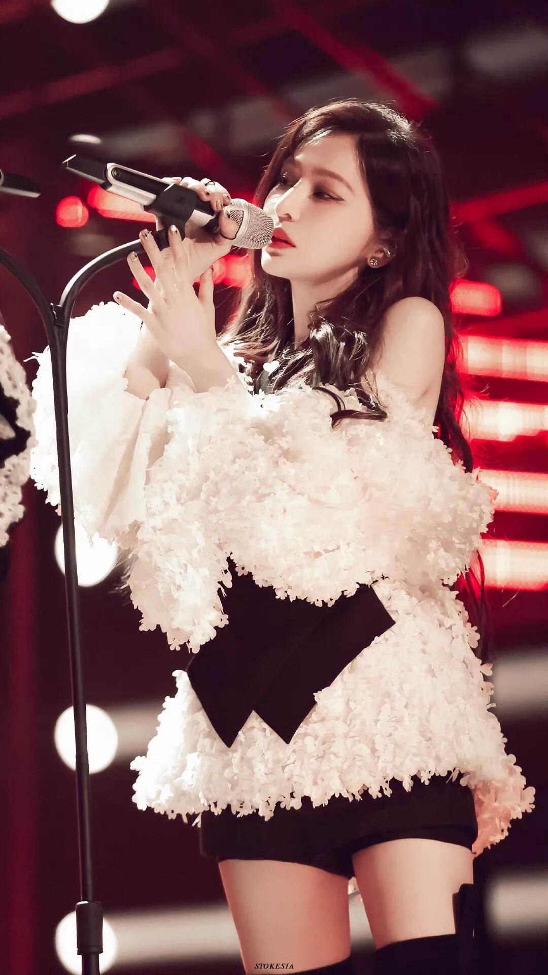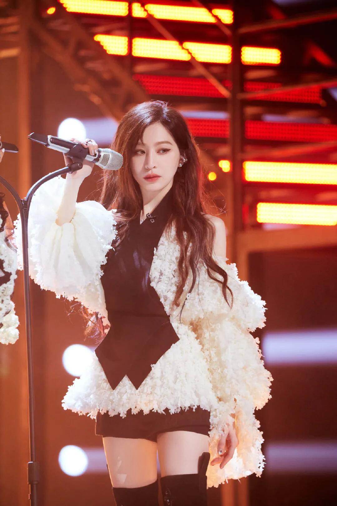 王心凌舞台裝是粉白色的露肩蕾絲衫,立體花朵的外圍視覺很符合她本身的甜美人設,露肩款又賦予了滿滿的純欲風,高腰黑色女團高腰短褲,手上的素色指環無意中帶上了既有爵士舞的火熱,長筒靴的助力更顯氣場一米八,全身上下的細節無一多余,酷女孩造型輕松呈現!