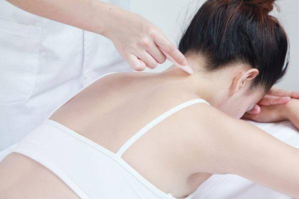 刮痧:在穴位上抹上经络油,用刮痧板角部由上至下刮拭百劳穴,隔天一次,以出痧为度,可治疗颈项强痛、角弓反张等病症。