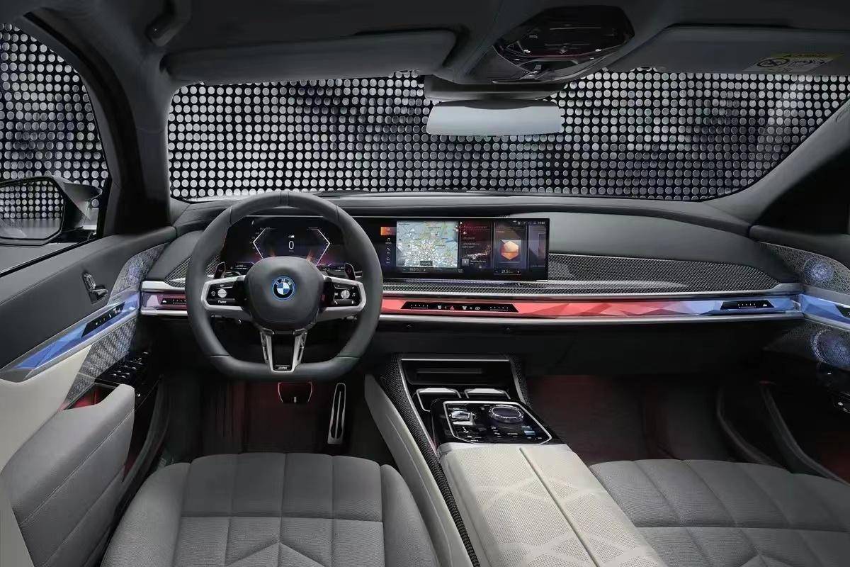 外觀方面,新車采用了黑化處理,前臉采用了家族化的雙腎形進氣格柵設計,內部采用直瀑式結構進行裝飾,展現出強烈的氣勢感。大燈組采用分體式設計,日行燈呈瞇瞇眼狀,遠近光照明效果扁平而個性化。經過黑化處理后,寶馬的分體式大燈與M760Le xDrive的運動定位相得益彰。