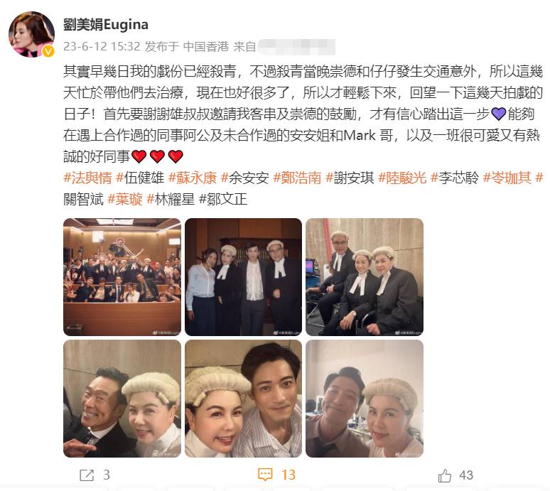 很久没拍戏的刘美娟,最近获邀出演电视剧《法与情》,搭档有余安安、郑浩南、苏永康、叶璇、关智斌等。从她分享的剧照来看,她跟苏永康都是演大律师。