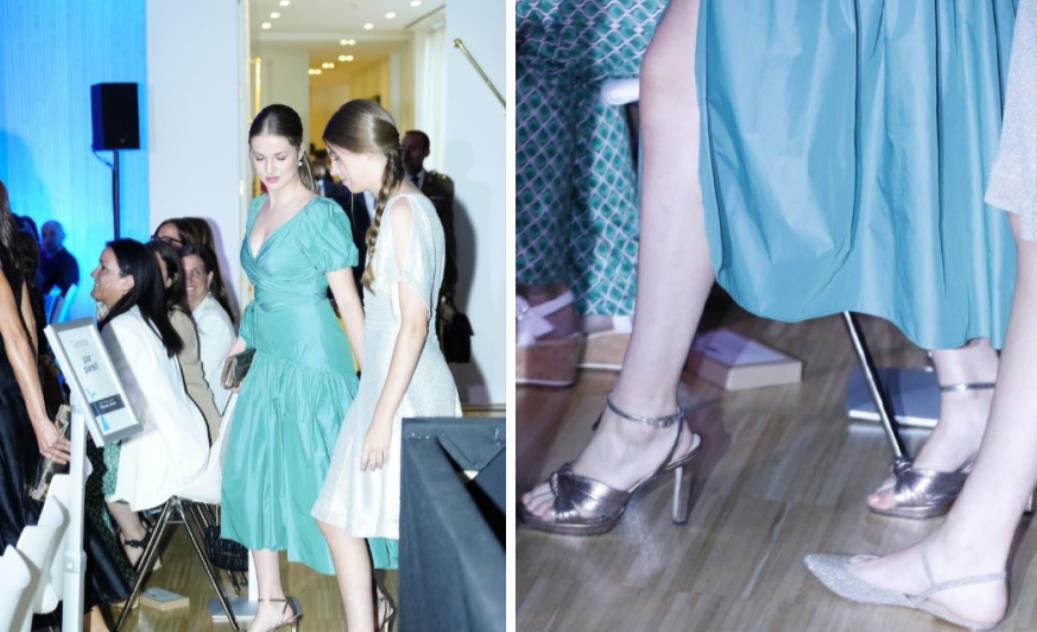 果然,王儲又穿了高跟鞋,不過這次索菲亞公主不見了,所以她徹底放飛自我,選擇了一雙半高跟鞋。她與母親并肩而立,站姿挺拔,看上去就像一位女王;然而,她的母親穿的鞋子和大公主的鞋跟一樣高,比他的女兒矮不了多少,這徹底暴露了比母親還高的西班牙王后的真實身高。
