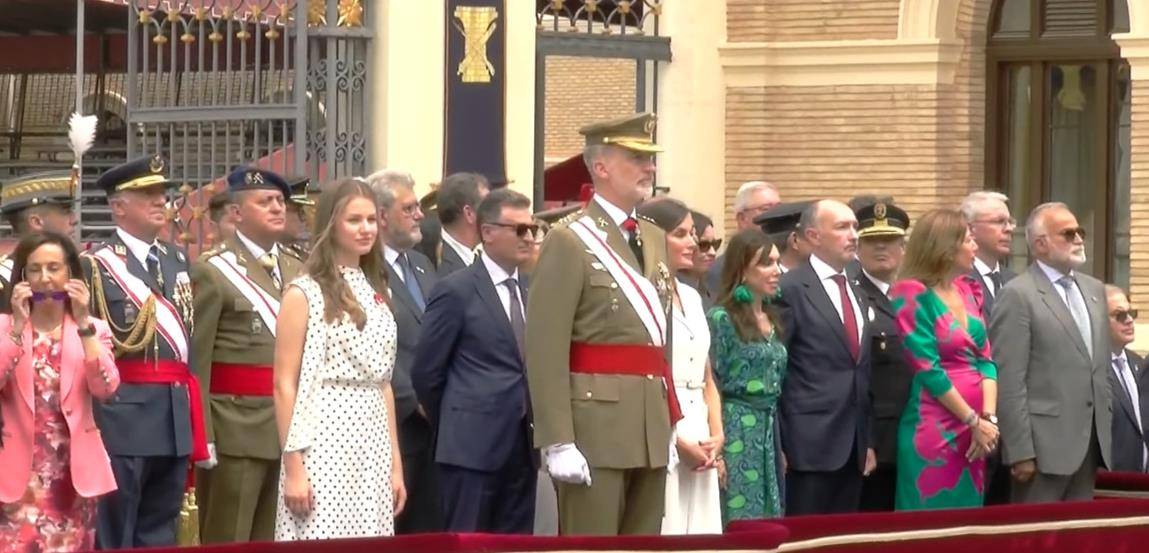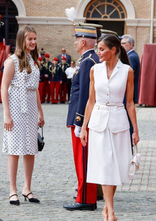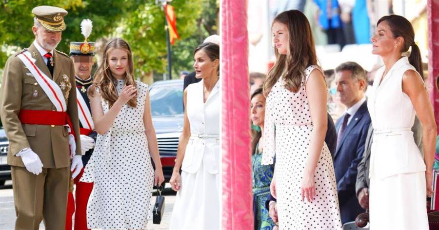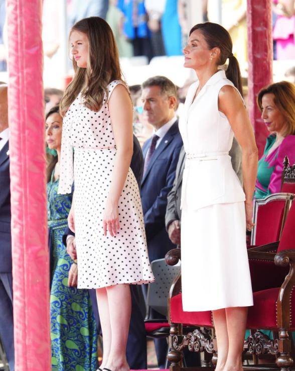 大公主的新造型以圓點裙亮相。無袖的設計顯瘦,比媽媽還高。只是不知道兩人的鞋跟高度是否一樣?畢竟萊昂諾爾為了保住未來女王的面子,長期穿高跟鞋。主要原因是妹妹太時尚了,身材已經超越了他的母親和姐姐。