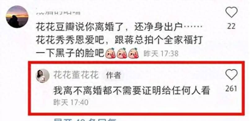 首先,董花花本人回應過外界的失婚傳聞,當時,她的說法是:「我離不失婚,都不需要證明給任何人看。」
