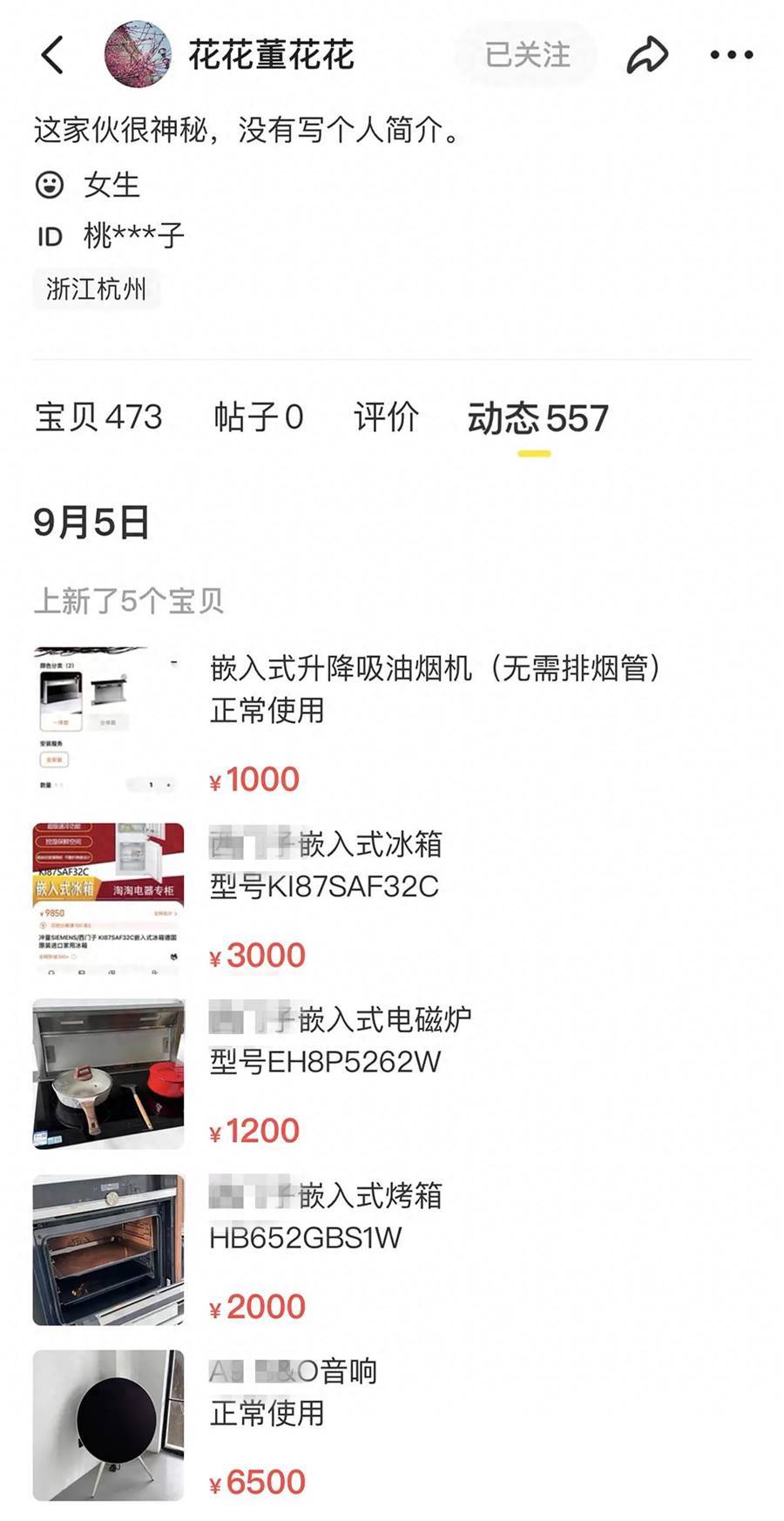 9月5日,有網友意外發現董花花在某二手閑置平台上上架了大量閑置家電設備。