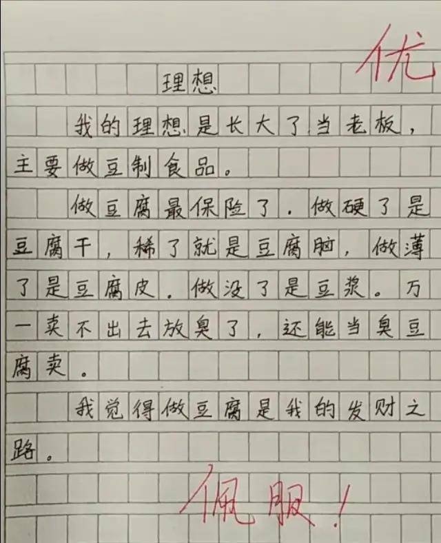 理想人人有,不同时代人的理想都带有明显的时代烙印。七八十年代,小孩子的理想一般就是好好学习,长大当老师、当医生、当解放军、当科学家等等,一个个理想高大上。可是,现在的孩子的理想变了,这个孩子的理想是当老板。为什么要当老板?当老板能挣大钱呀!不过,文中的小作者在文章的结尾都亮明观点了:我觉得做豆腐是我的发财之道。小小年纪就有经济头脑,知道做豆腐没有折损,也是奇了!看来,这孩子还真有做老板的潜质呢!连老师也忍不住“佩服”,给了一个大大的“优”。