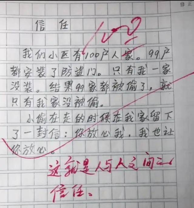 不过,孩子是想借助夸张的手法,表达某种情感,希望人与人之间多份信任。有了信任,人与人就多了份温暖。老师的批语也神了:这就是人与人之间的信任。说得真好!