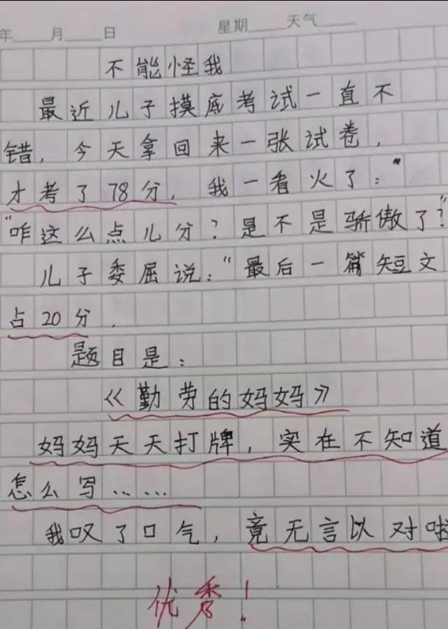 这篇文章不仅内容新颖,而且构思也奇特,立意尤其高远。小作者以“爸爸”的身份和口吻来写文,一般学生还真想不到。儿子考了78分,“我”火了,“儿子”委屈啊!因为最后一篇短文《勤劳的妈妈》占了20分,而儿子只写了一句话:“妈妈天天打牌,实在不知怎么写”。