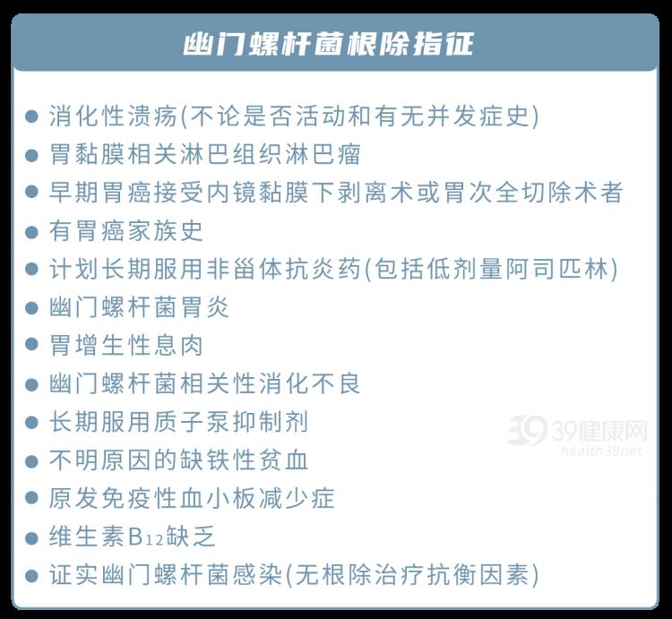 鉍劑四聯方案(質子泵抑制劑(PPI)+鉍劑+2 種抗菌藥物),是目前全國根除幽門螺桿菌的主要治療方案,根除率可高達90%。根據中華消化雜志,建議符合以下指征的人群進行根除治療。