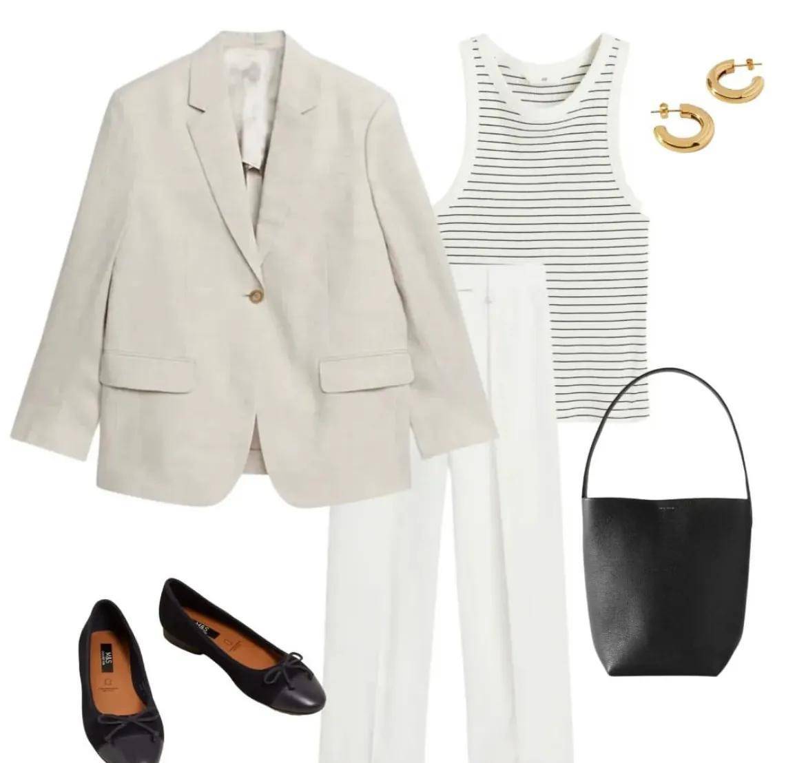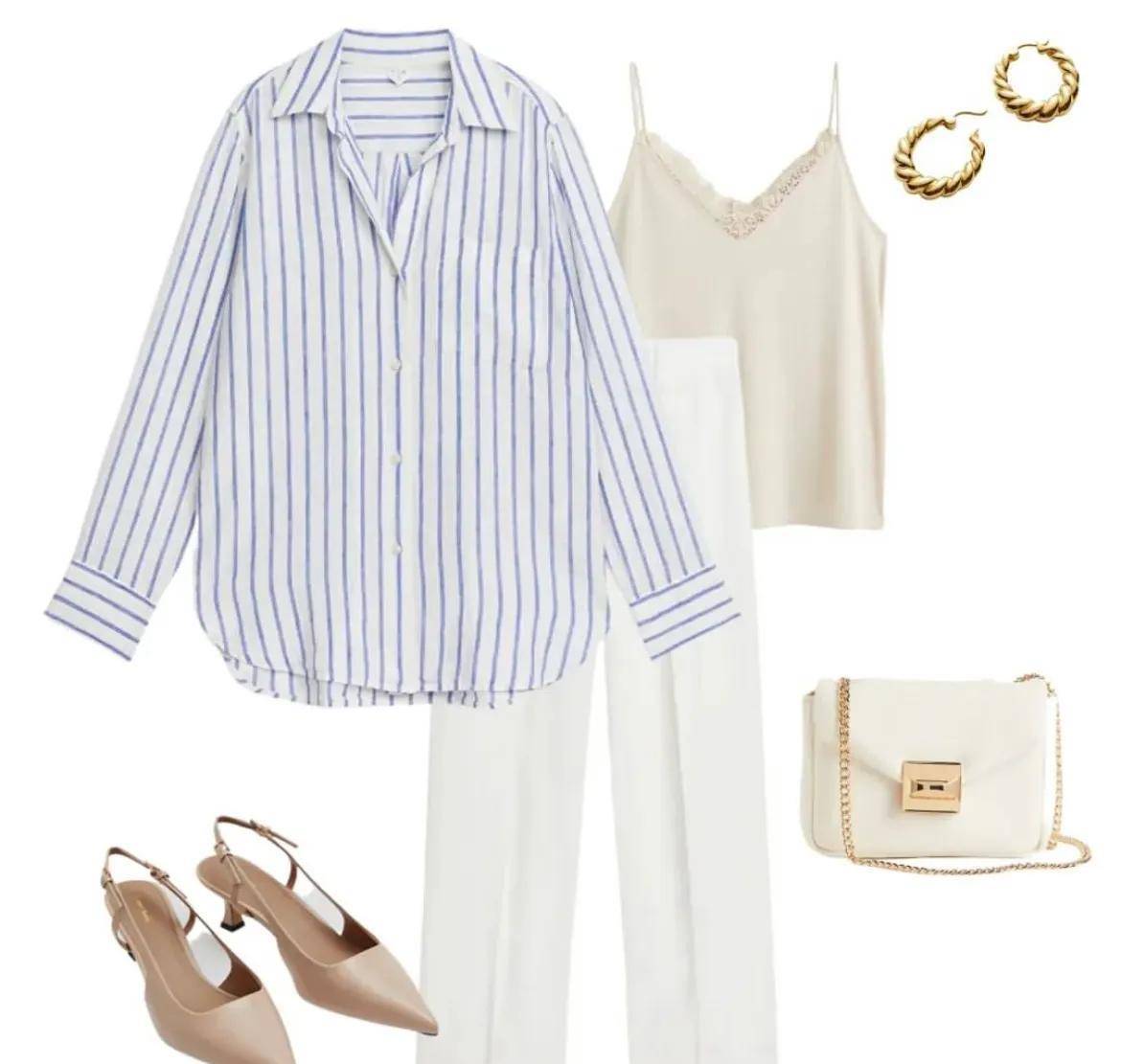 襯衫也是一個不錯的搭配。藍色細條紋利用垂直線條搭配白色褲子,打造出更修身的線條。也可以打開紐扣,內搭乳白色真絲吊帶背心,打造簡約精致的風格。