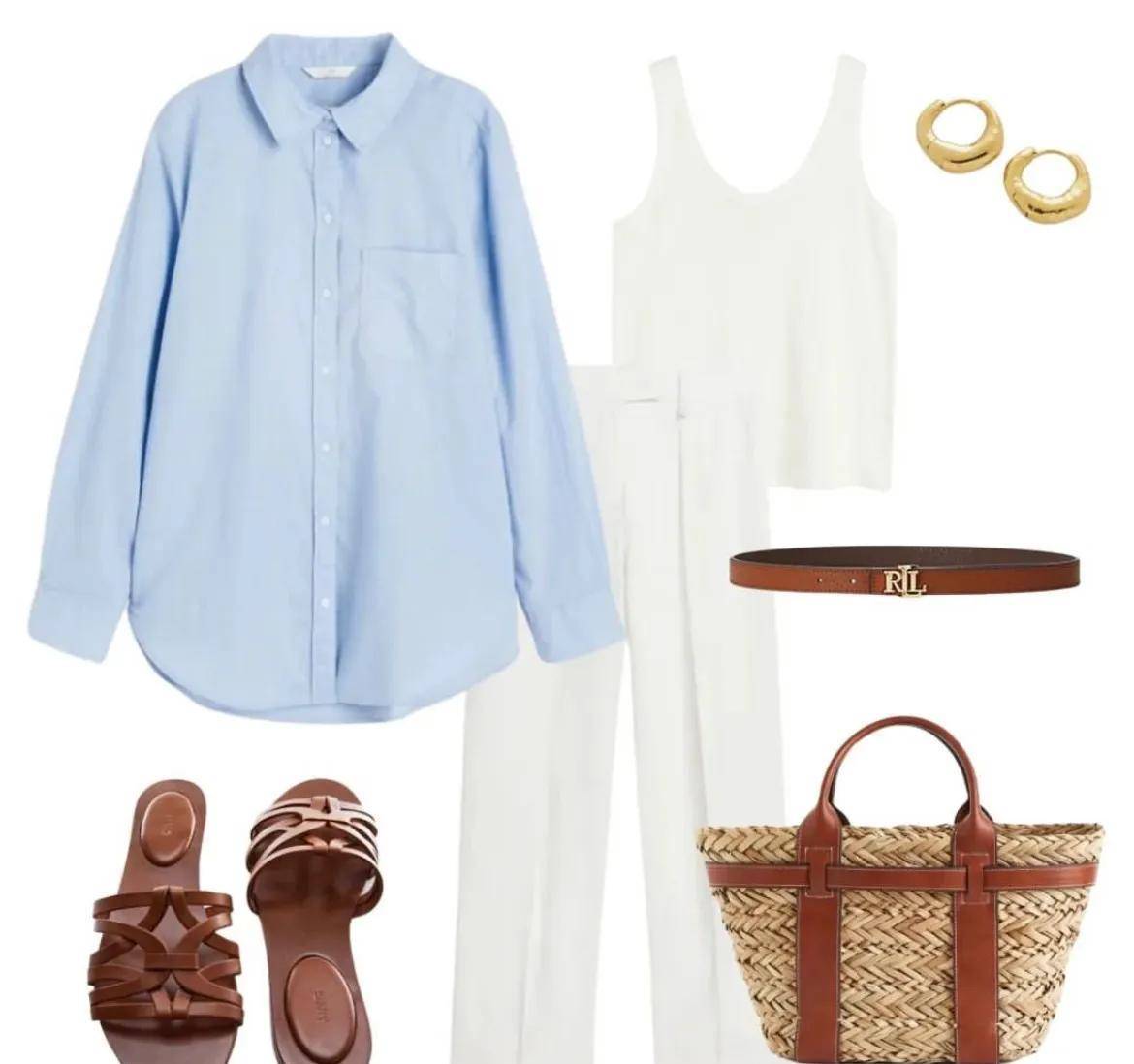 襯衫的款式和顏色有很多選擇,基本的淺藍色和白色就很搭配。背上一個藤條背包,給你一種夏日度假風格的感覺。